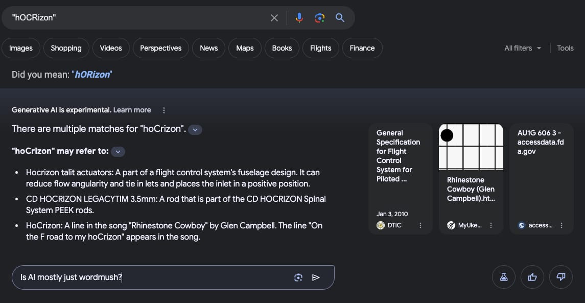 You see the irony. I was thinking about the edge of optical character recognition— really just wondering if anyone had called it the hOCRizon— when the third largest company on Earth demonstrated the limits of OCR by volunteering gibberish about airplanes, surgery and Glen Campbell.